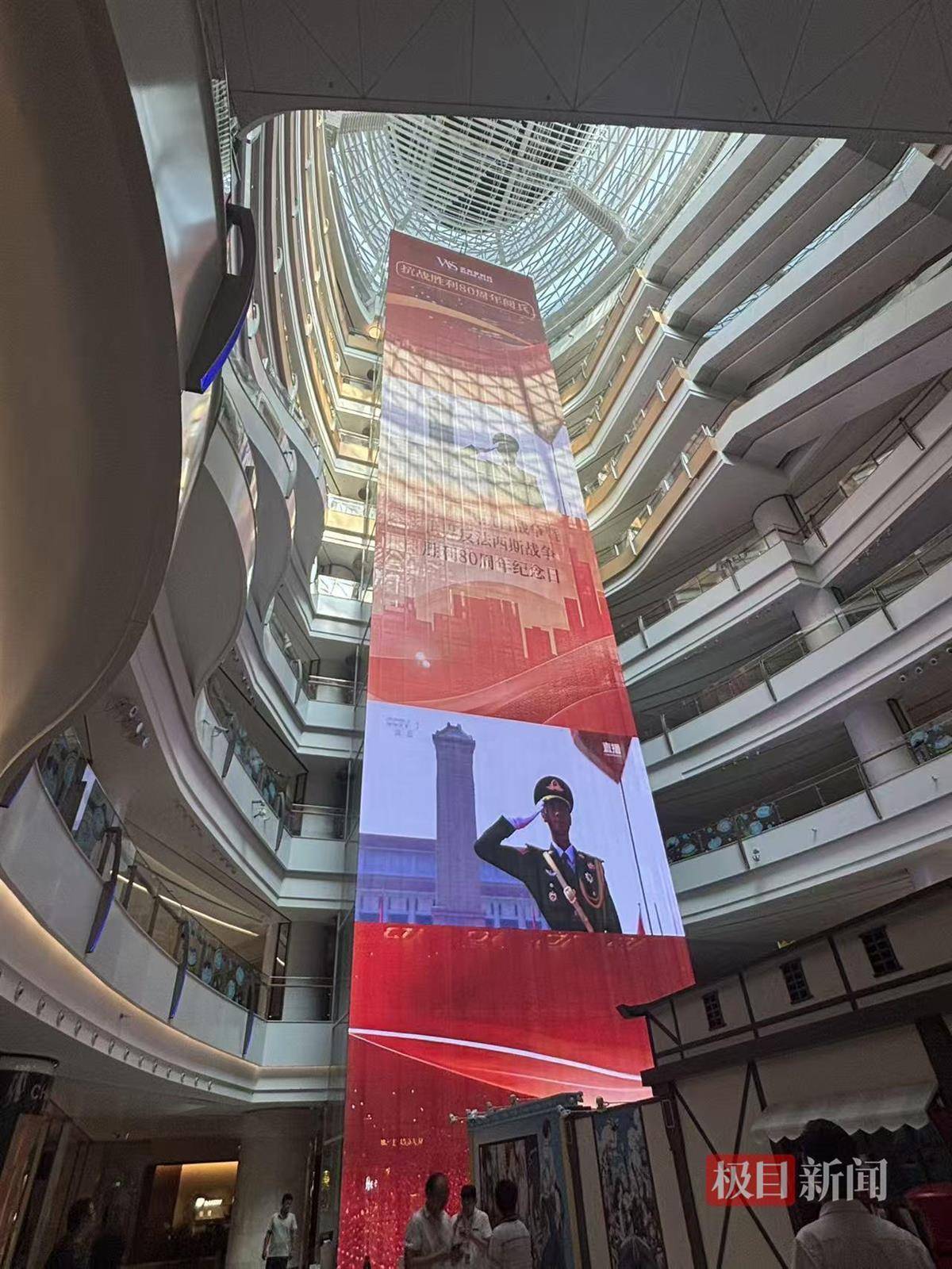 9月3日,中国以一场盛大阅兵,纪念中国人民抗日战争暨世界反法西斯战争胜利80周年。上午10时,极目新闻记者在武商梦时代看到,不少人聚集在中庭60米高的瀑布大屏前,观看纪念大会和阅兵式直播。